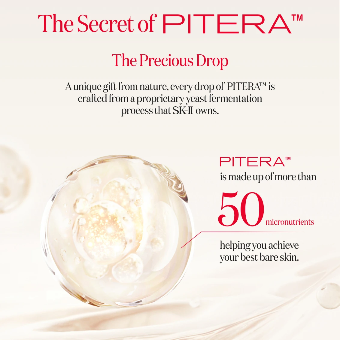 PITERATM : SK-II’s exclusive and naturally derived ingredient crafted from a proprietary fermentation process of a unique yeast strain.
